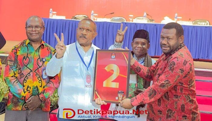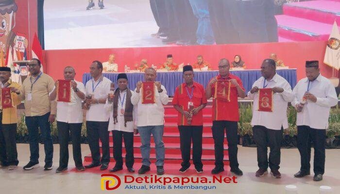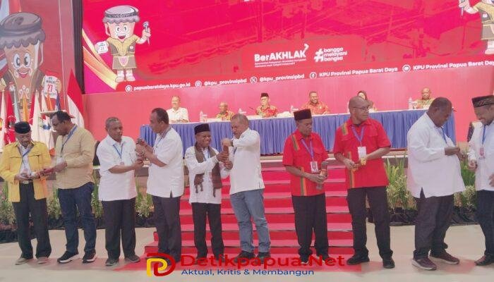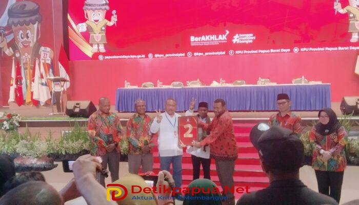 Sorong, Detikpapua.Net – KPU Provinsi Papua Barat Daya, resmi menetapkan nomor urut 5 pasangan calon gubernur dan wakil gubernur, untuk bertarung dalam Pilkada 27 November 2024. Penetapan nomor urut tersebut dirangkaikan dengan pelaksanaan deklarasi Pilkada damai yang digelar di Aula Lambert Jitmau, Kota Sorong, Senin (23/09/2024).