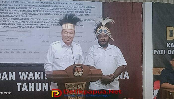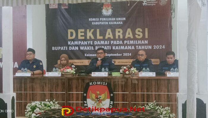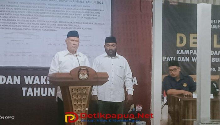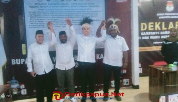Kaimana, Detikpapua.Net – Komisi Pemilihan Umum Daerah Kabupaten Kaimana menggelar deklarasi kampanye Damai bersama kedua pasangan calon Hasan Achmad – Isak Wariensy (Nomor Urut 1) dan Fredy Thie – Sobar Somat Puarada (Nomor urut 2).