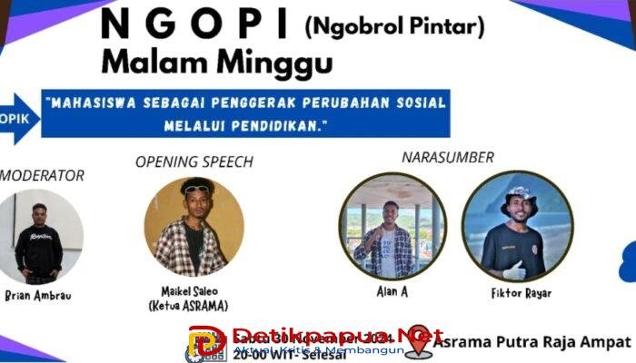 Manokwari, Detikpapua.Net – Pengurus Asrama Mahasiswa Raja Ampat di Manokwari sukses mengadakan kegiatan NGOPI (Ngobrol Pintar) dengan topik “Mahasiswa Sebagai Penggerak Perubahan Sosial Melalui Pendidikan”di Manokwari, Sabtu (30/11/2024).