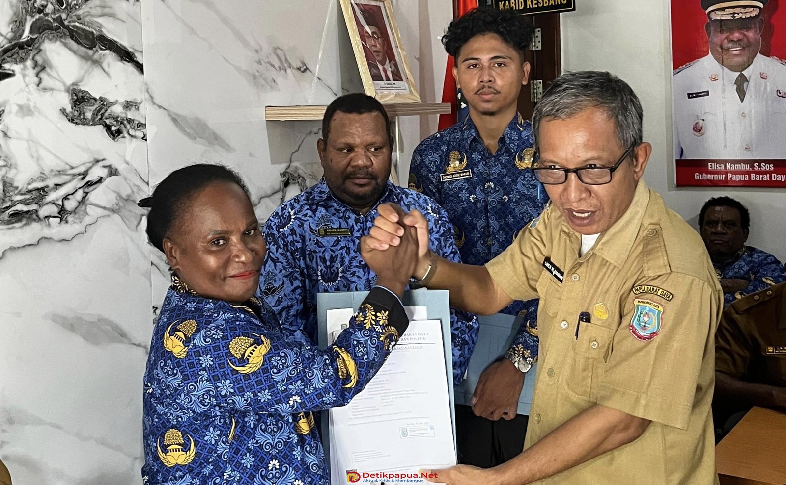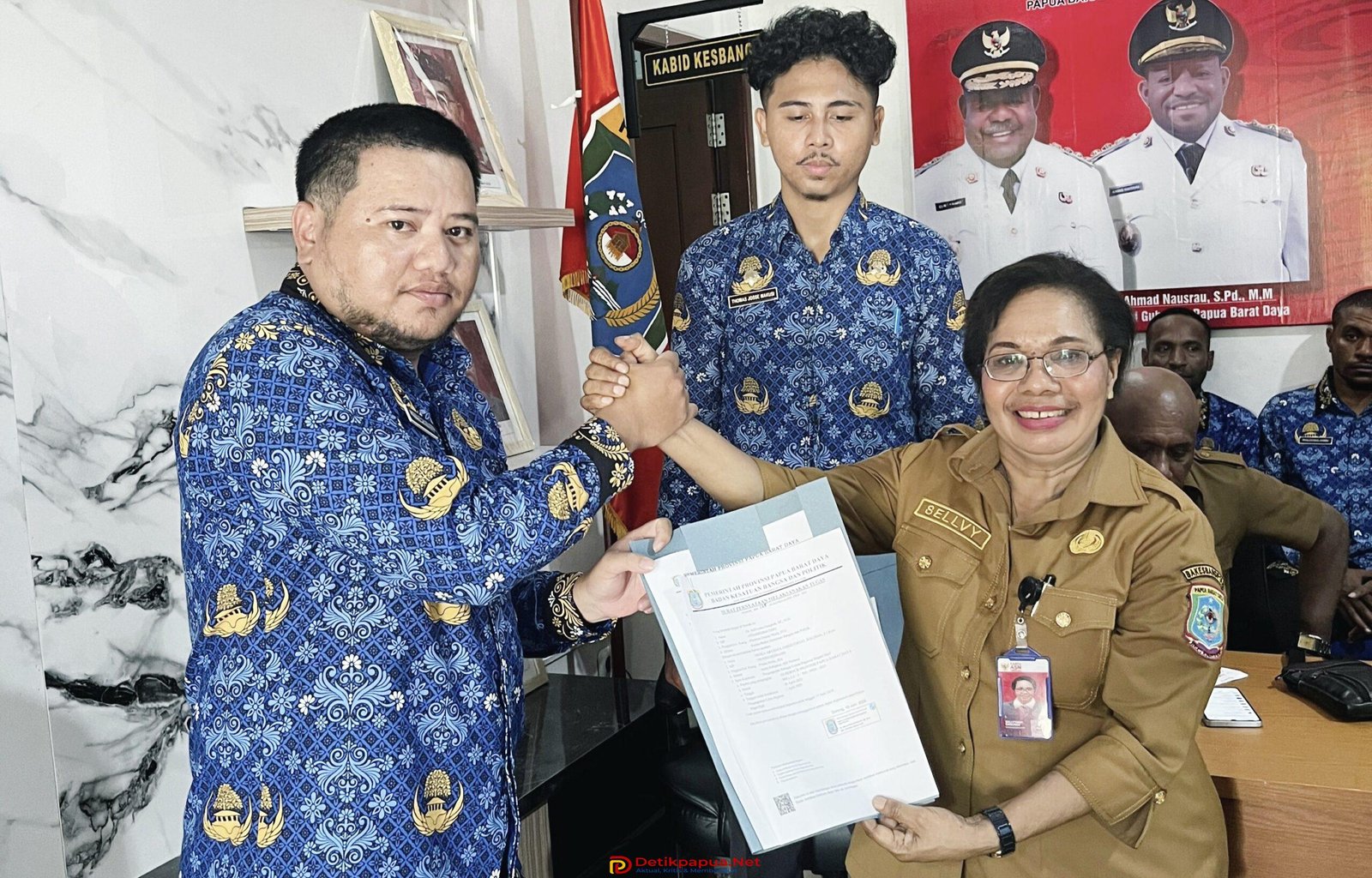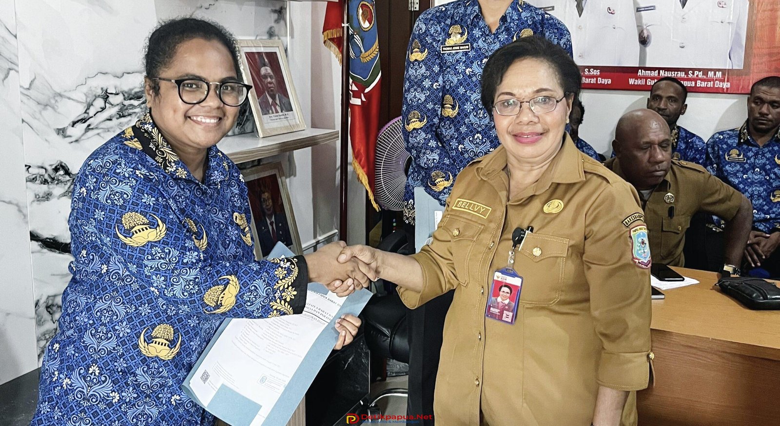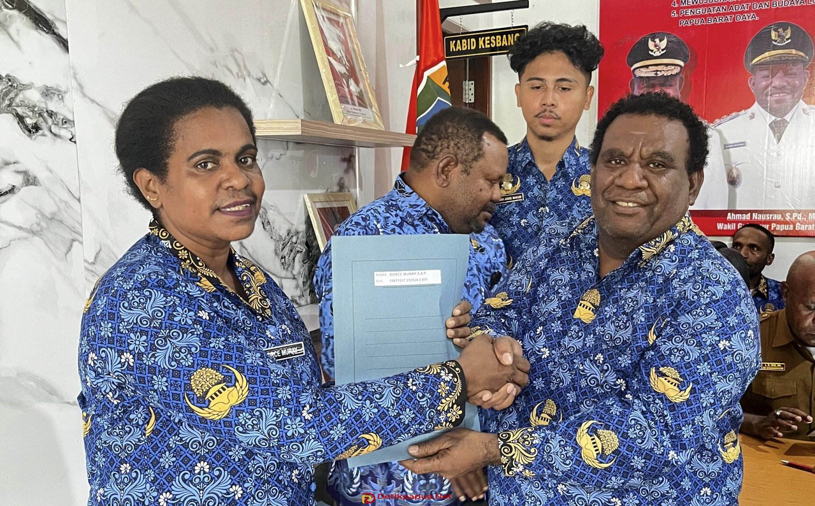 Kepala Badan Kesbangpol Provinsi Papua Barat Daya Dr. Sellvyana Sangkek, SE.,M.Si saat menyerahkan nota dinas kepada salah seorang Calon ASN yang ditempatkan di Kantor Badan Kesbangpol PBD, Selasa (17/06/2025). Foto/Yohanes Sole