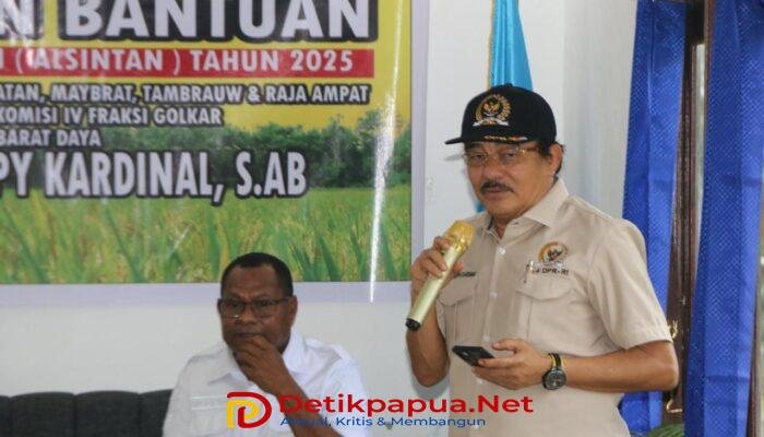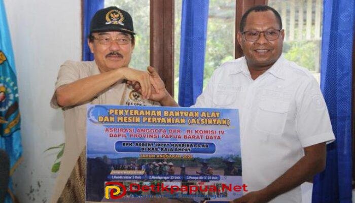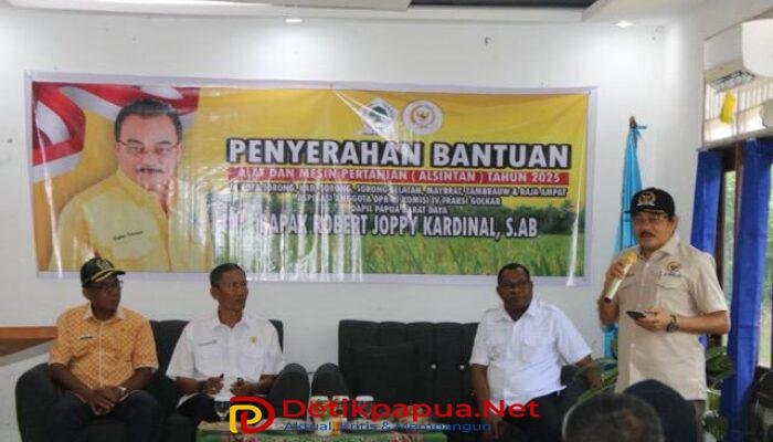 Waisai, Detikpapua.Net– Anggota DPR RI Komisi IV Dapil Provinsi Papua Barat Daya, Robert Joppy Kardinal, S.AB menyerahkan bantuan alat dan mesin pertanian (alsintan) kepada petani di Kabupaten Raja Ampat, Papua Barat Daya pada Rabu (25/6/2025).