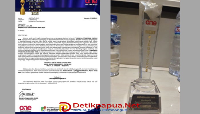Sorong, Detikpapua.Net – Anggota DPR Papua Barat Daya (PBD) Willem Asem, SE dinobatkan sebagai tokoh legislatif terbaik (Best Legislative Figure) tahun 2025 se-Indonesia. Prestasi membanggakan ini diberikan oleh Majalah Nasionel The One Magazine kepada Willem Asem, dalam acara Indonesia Future Figure Awards 2025 bertema “Indonesia inspiring figure” yang digelar di Swiss-Belhotel Rainforest-Kuta Bali, Jumat (27/06/2025).