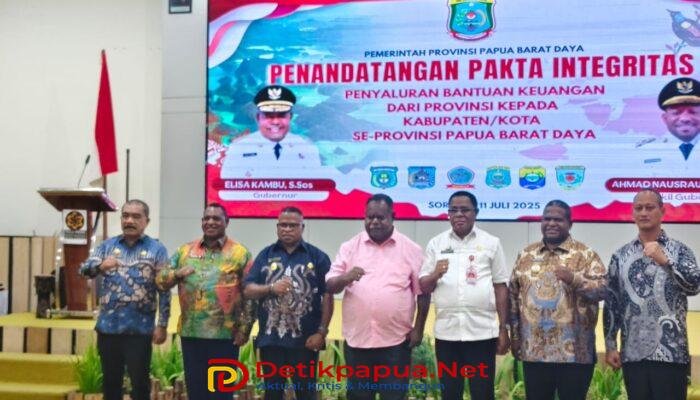 Foto bersama Usai Penandatanganan Pakta Integritas penyaluran bantuan keuangan dari provinsi kepada kabupaten/kota se-provinsi Papua Barat Daya, Foto/Istimewah.