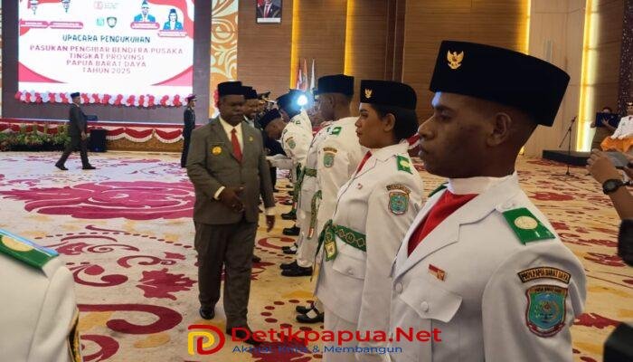 Sorong, Detikpapua.Net– Gubernur Papua Barat Daya Elisa Kambu, S.Sos., secara resmi mengukuhkan Pasukan Pengibar Bendera Pusaka (Paskibraka) Tingkat Provinsi Papua Barat Daya Tahun 2025 dalam upacara khidmat di Sorong, Jumat malam (15/8/2025). Acara ini dihadiri Forkopimda, kepala perangkat daerah, tokoh agama, tokoh adat, tokoh perempuan, tokoh pemuda, orang tua, serta para pelatih dan pembina Paskibraka.