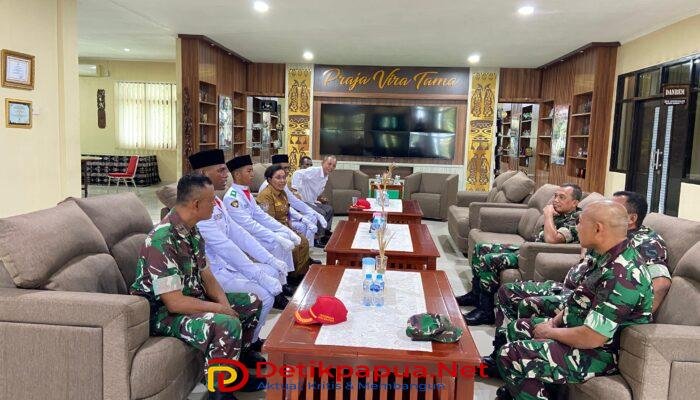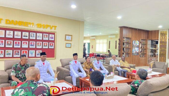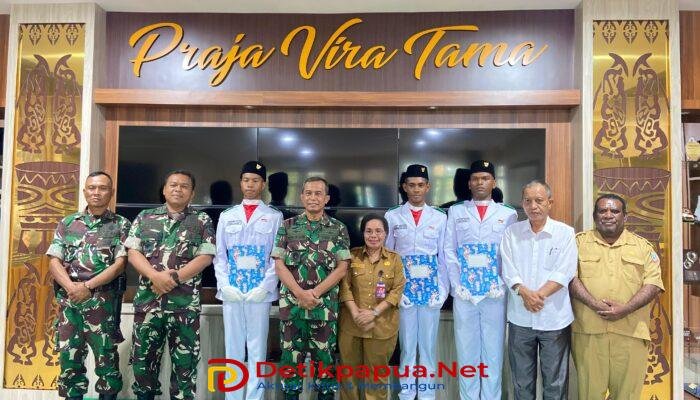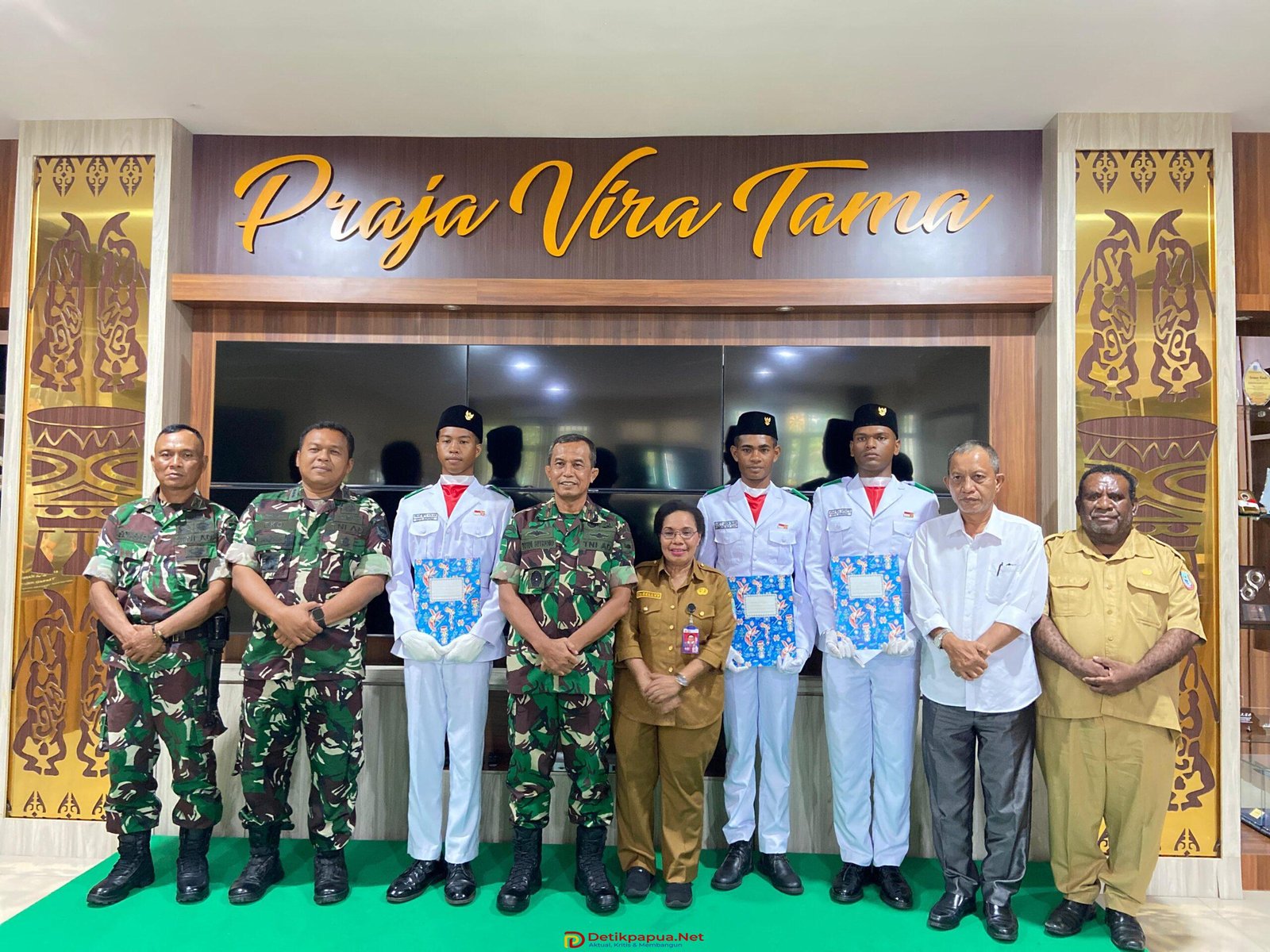 Kepala Badan Kesbangpol Papua Barat Daya Dr. Sellvyana Sangkek, SE.,M.Si bersama ketiga anggota Paskibraka saat bertemu Danrem 181/PVT perihal pemberian reward, Selasa (19/08/2025). Foto/Yohanes Sole