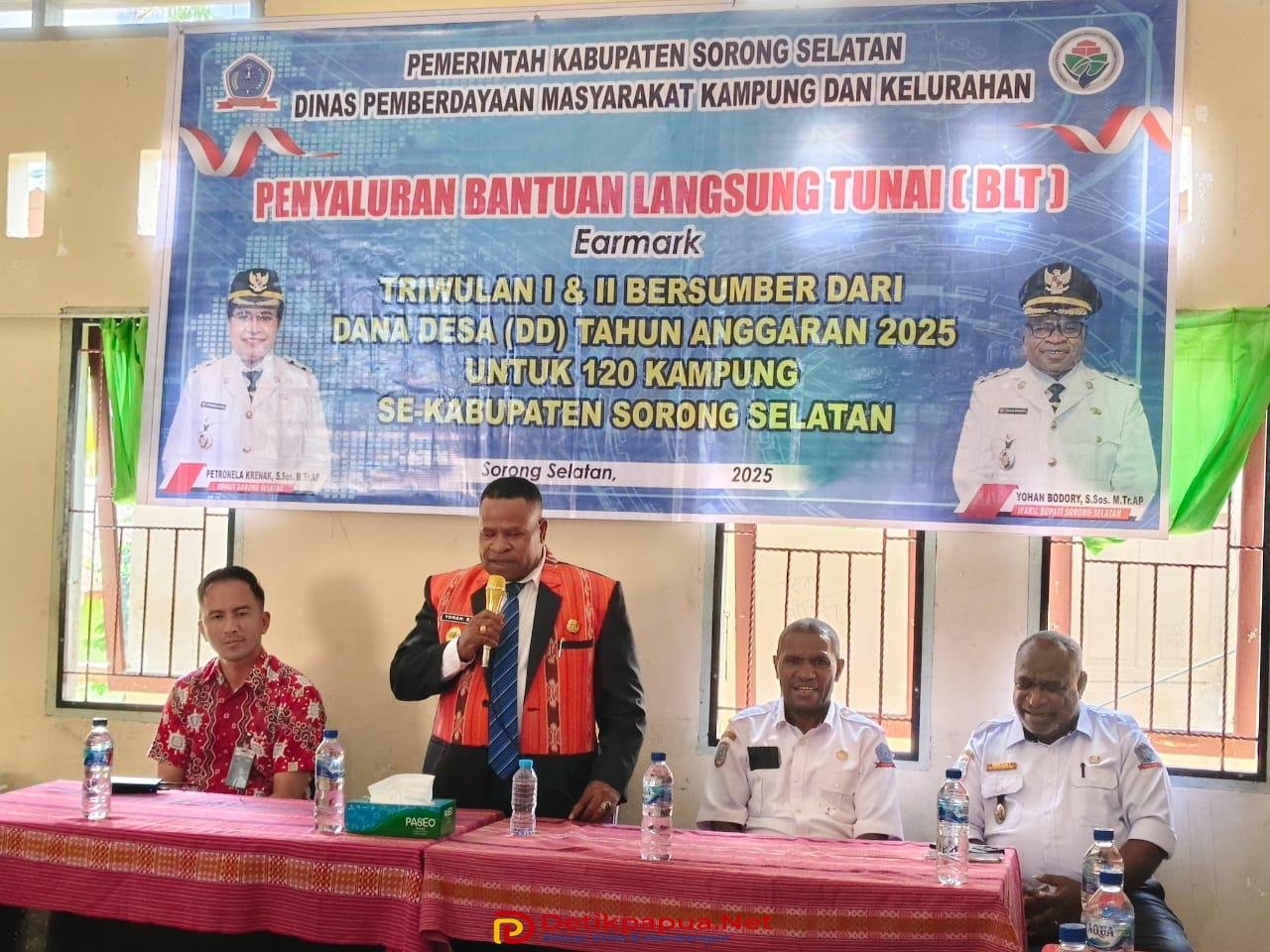 Teminabuan, Detikpapua.Net — Wakil Bupati Sorong Selatan, Yohan Bodori, S.Sos., M.Tr. AP., hari ini memberikan pengarahan sekaligus menyerahkan secara simbolis Bantuan Langsung Tunai (BLT) kepada masyarakat di beberapa distrik. Penyerahan ini dilakukan di Distrik Teminabuan dengan melibatkan perwakilan dari empat distrik, yaitu Kais, Kais Darat, Teminabuan, dan Konda. Rabu,(20/8)