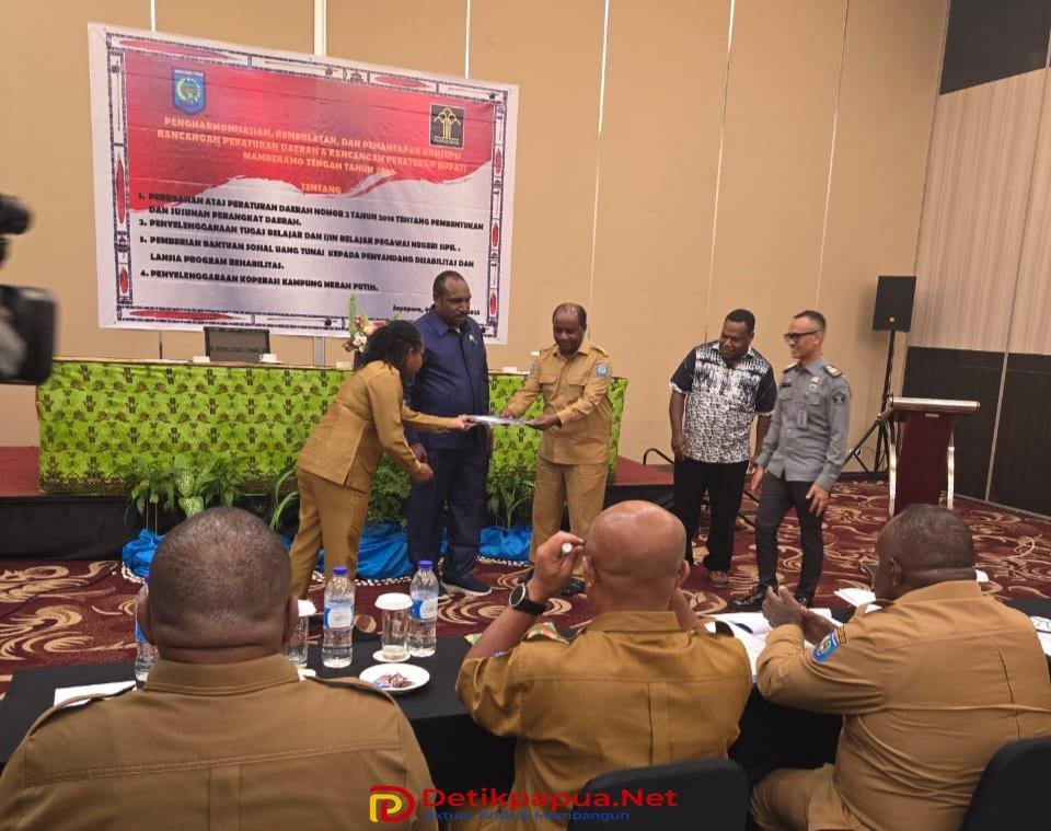 Jayapura, Detikpapua.Net – Pemerintah Kabupaten Mamberamo Tengah bersama DPRD melaksanakan kegiatan pengharmonisasian, pembulatan, dan pemantapan konsepsi terhadap empat rancangan peraturan daerah (Raperda) serta rancangan peraturan bupati (Raperbup) tahun 2025. Acara ini berlangsung di Hotel Horison Padang Bulan, Jayapura, pada Selasa, (09/09/2025).