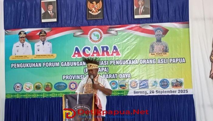Sorong, Detikpapua.Net – Gubernur Papua Barat Daya (PBD) Elisa Kambu, S.Sos secara resmi mengukuhkan kepengurusan Forum Gabungan Asosiasi Pengusaha OAP (FORGAPA) Provinsi Papua Barat Daya, di Aula Honai Luxio Hotel, Jumat (26/09/2025).