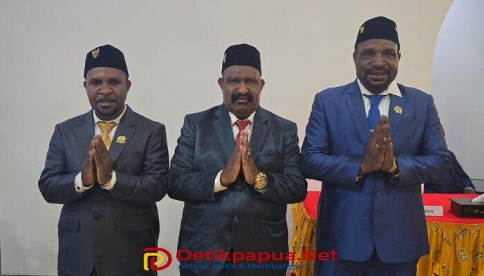 Ketua DPRD Kabupaten Mamberamo Tengah Piter Togodly, S.Ip,. (Tengah), didampingi Wakil ketua I DPRD Mamberamo Tengah Leonard Doga, SE., (Kiri) dan Wakil ketua II DPRD Mamberamo Tengah Waima Endambia, S.Sos., (Kanan) saat di wawancarai awak media pada Senin, (29/09/2025). Foto/Yohanes Kossay.