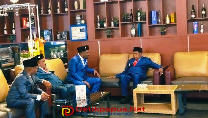 Ketua DPRD Kabupaten Mamberamo Tengah Piter Togodly, S.Ip,. (Tengah), didampingi Wakil ketua I DPRD Mamberamo Tengah Leonard Doga, SE., (Kiri) dan Wakil ketua II DPRD Mamberamo Tengah Waima Endambia, S.Sos., (Kanan) saat di wawancarai awak media pada Senin, (29/09/2025). Foto/Yohanes Kossay.
