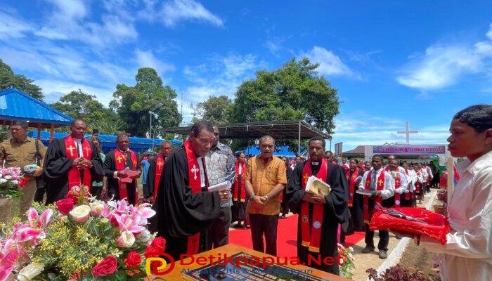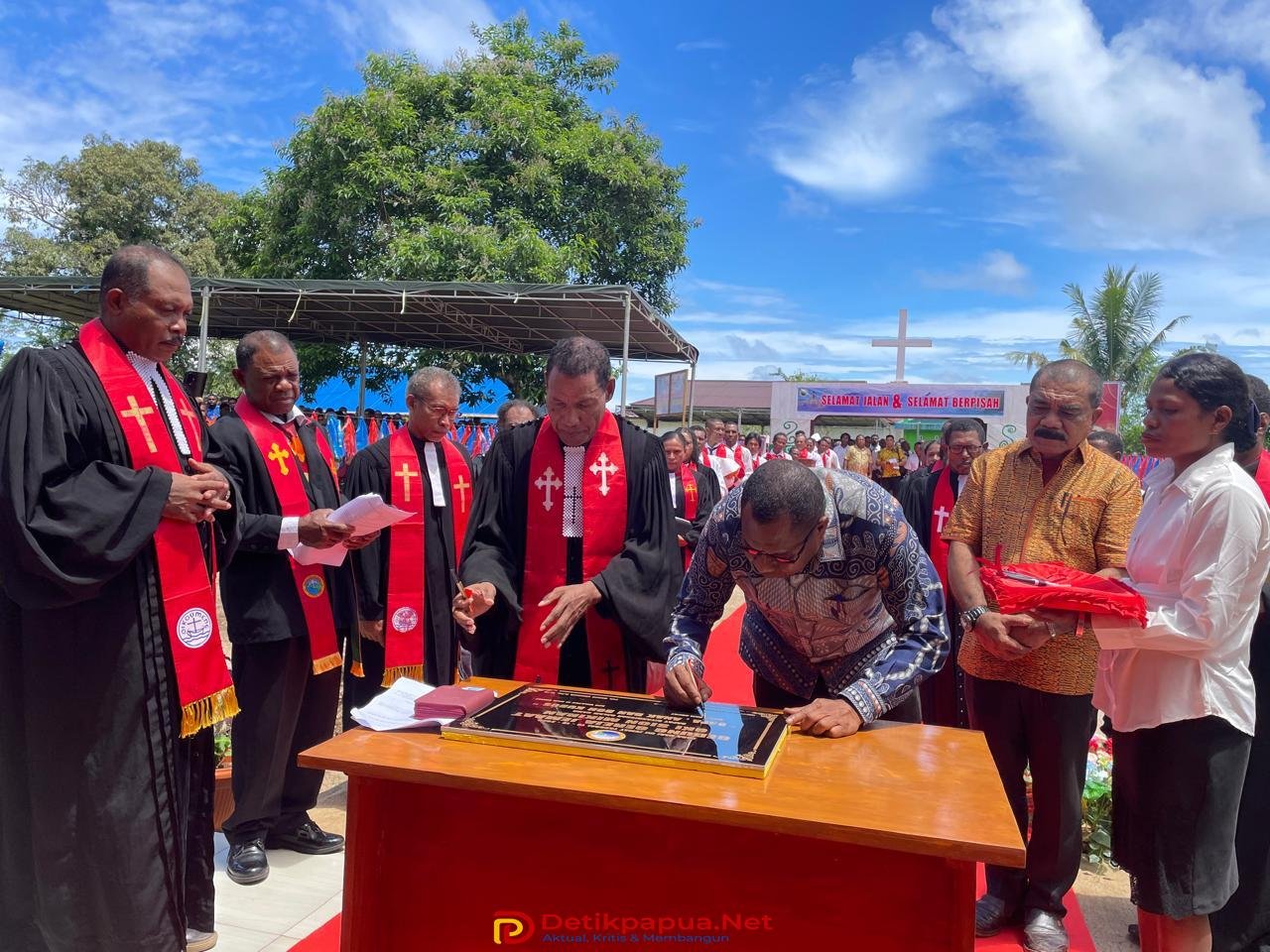 Prosesi diawali dengan ibadah di gedung gereja lama, dilanjutkan dengan perarakan menuju gedung baru yang diikuti seluruh jemaat, Bupati, para kepala dinas, dan tamu undangan. Di pintu gereja, Bupati dan Wakil Bupati melakukan pengguntingan pita serta penandatanganan prasasti peresmian bersama Pdt. Genos Burdam, yang kemudian dilanjutkan dengan penyerahan simbolis kunci gereja dari panitia pembangunan kepada pejabat gereja.