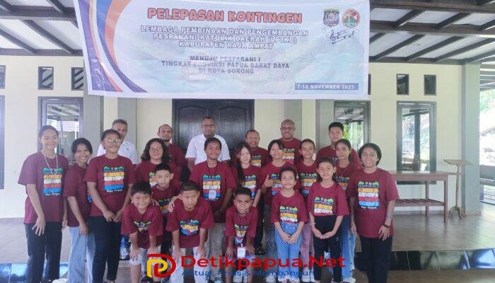 Waisai, Detikpapua.Net – Suasana penuh sukacita dan khidmat mewarnai halaman pendopo Gereja Katolik Stasi St. Maria Mater Dei Waisai, Rabu (5/11/2025), saat dilangsungkan pelepasan kontingen Lembaga Pembinaan dan Pengembangan Pesparani Katolik Daerah (LP3KD) Kabupaten Raja Ampat menuju Pesparani Katolik I tingkat Provinsi Papua Barat Daya di Kota Sorong.