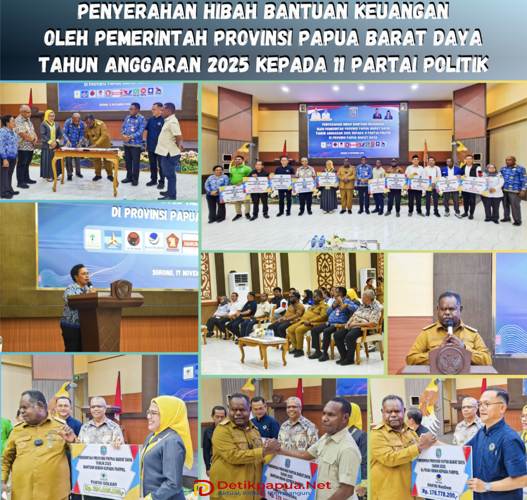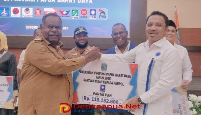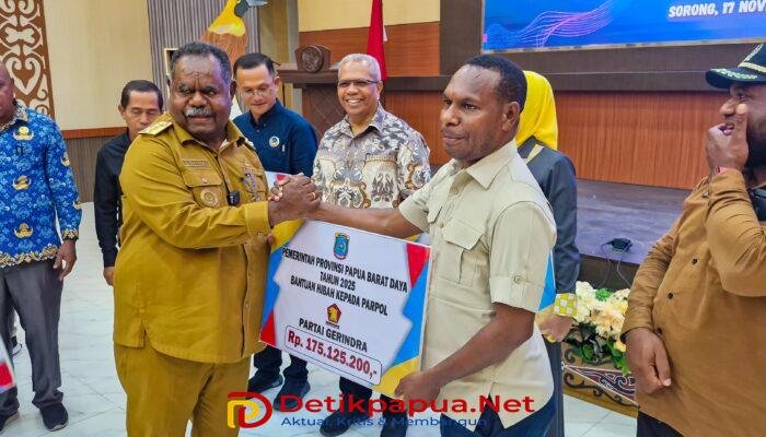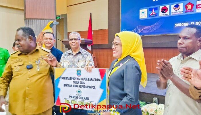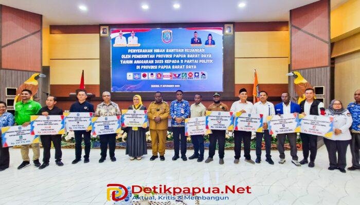 Dorong, Detikpapua.Net – Pemerintah Provinsi Papua Barat Daya melakukan penyerahan hibah bantuan keuangan bagi 11 Partai Politik (Parpol) pemenang Pemilu di Provinsi Papua Barat Daya. Acara penyerahan berlangsung di ruang rapat Lantai III Kantor Gubernur Papua Barat Daya, Senin (17/11/2025).