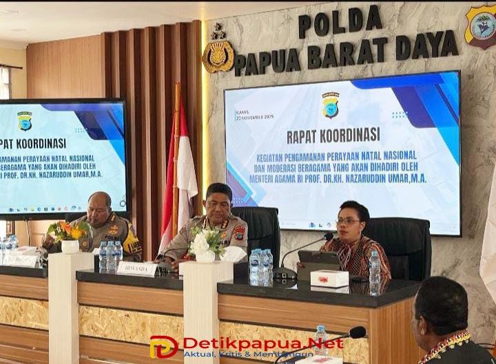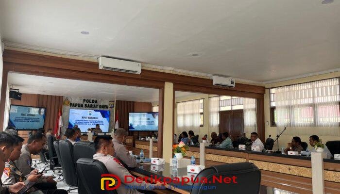 Dalam Rakor yang berlangsung di Aula Mapolda Papua Barat Daya, Kamis (20/11/2025) ini Kaban Kesbangpol Dr. Sellvyana Sangkek memaparkan sejumlah hal yang berkaitan dengan komitmen pemerintah Provinsi Papua Barat Daya dalam kegiatan kunjungan Menteri agama dimaksud.