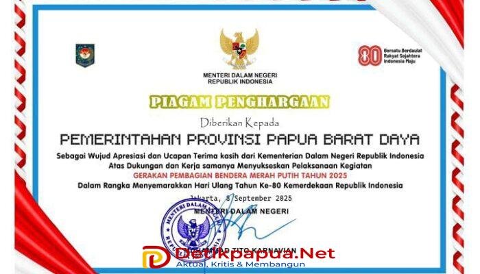 Sorong, Detikpapua.Net – Pemerintah pusat melalui Kementerian Dalam Negeri (Kemendagri) memberikan apresiasi melalui Piagam penghargaan yang diberikan kepada Pemerintah Provinsi Papua Barat Daya. Penghargaan tersebut merupakan pengakuan atas partisipasi aktif Pemprov PBD dalam gerakan pembagian bendera Merah Putih, yang merupakan bagian dari perayaan HUT ke-80 Kemerdekaan Republik Indonesia di Papua Barat Daya.