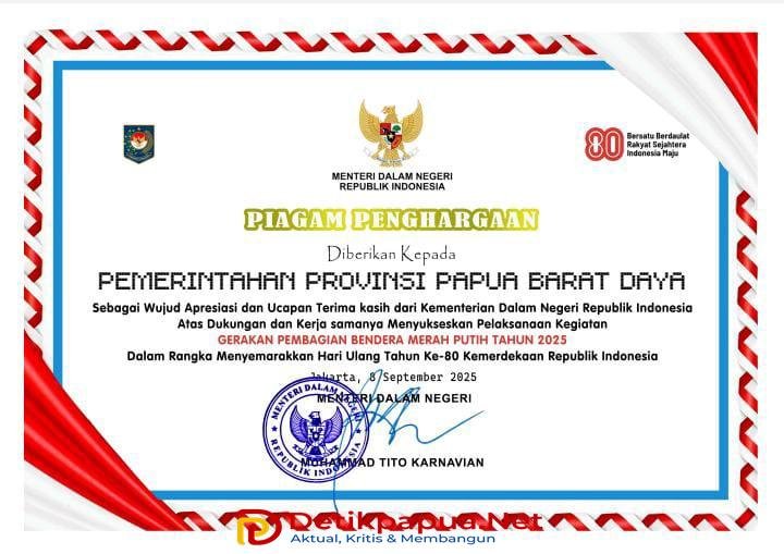 Sorong, Detikpapua.Net – Pemerintah pusat melalui Kementerian Dalam Negeri (Kemendagri) memberikan apresiasi melalui Piagam penghargaan yang diberikan kepada Pemerintah Provinsi Papua Barat Daya. Penghargaan tersebut merupakan pengakuan atas partisipasi aktif Pemprov PBD dalam gerakan pembagian bendera Merah Putih, yang merupakan bagian dari perayaan HUT ke-80 Kemerdekaan Republik Indonesia di Papua Barat Daya.