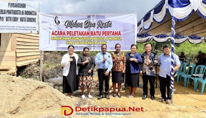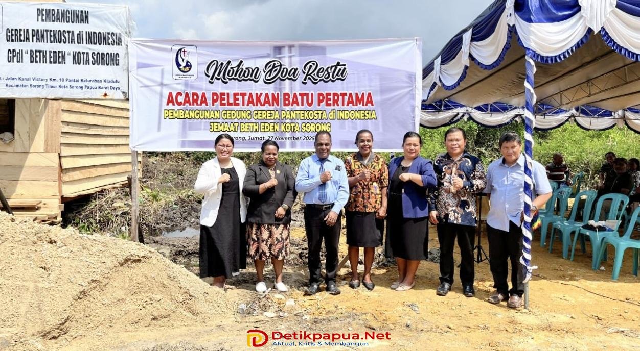 Sorong, Detikpapua.Net – Pembangunan Gedung Gereja Pantekosta di Indonesia (GPDI) Jemaat Beth Eden Kota Sorong, resmi dimulai usai dilakukannya acara Peletakan Batu Pertama Pembangunan Gedung Gereja tersebut pada Jumat (27/11/2025).