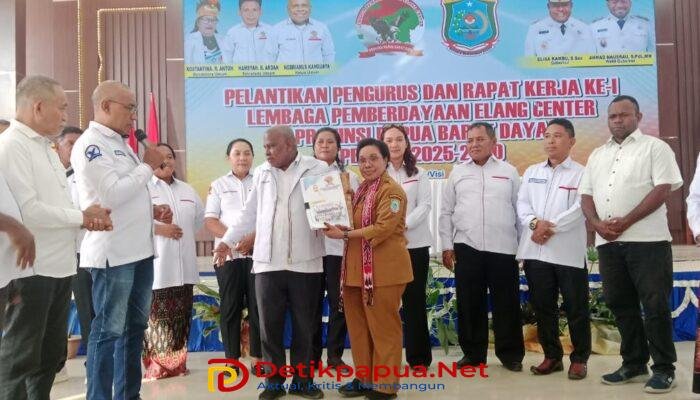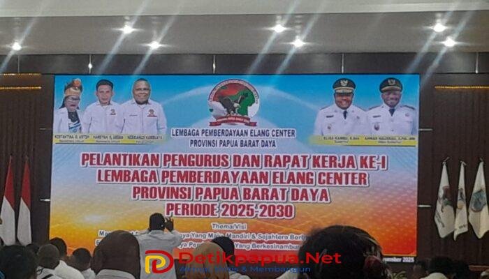 Sorong, Detikpapua.Net – Gubernur Papua Barat Daya Elisa Kambu, S.Sos didampingi Kepala Badan Kesatuan Bangsa dan Politik (Kesbangpol) Dr. Sellvyana Sangkek, SE.,M.Si menghadiri acara pelantikan pengurus dan Rapat Kerja (Raker) I Lembaga Pemberdayaan Elang Center (LPEC) Provinsi Papua Barat Daya, di Kota Sorong, Selasa (02/12/2025).