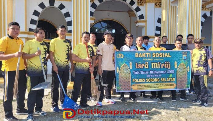 Teminabuan, Detikpapua.Net – Dalam rangka memperingati Isra Miraj Nabi Besar Muhammad SAW 1447 Hijriah/2026 Masehi, Polres Sorong Selatan melaksanakan kegiatan bakti sosial berupa kerja bakti bersih-bersih dengan mengusung tema “Isra Miraj Nabi Besar Muhammad SAW Memperteguh Keimanan dan Ketakwaan Personel Polri untuk Masyarakat dalam Aksi Kemanusiaan dan Kepedulian Sosial”.Selasa (20/1/2026).