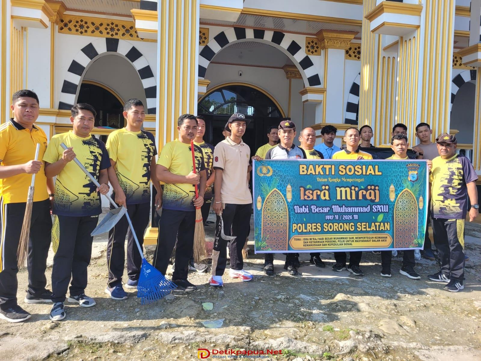 Teminabuan, Detikpapua.Net – Dalam rangka memperingati Isra Miraj Nabi Besar Muhammad SAW 1447 Hijriah/2026 Masehi, Polres Sorong Selatan melaksanakan kegiatan bakti sosial berupa kerja bakti bersih-bersih dengan mengusung tema “Isra Miraj Nabi Besar Muhammad SAW Memperteguh Keimanan dan Ketakwaan Personel Polri untuk Masyarakat dalam Aksi Kemanusiaan dan Kepedulian Sosial”.Selasa (20/1/2026).