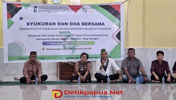 Sorong, Detikpapua.Net – Badan Koordinasi Himpunan Mahasiswa IsIam (Badko HMI) Provinsi Papua Barat Daya menggelar acara syukuran dan doa bersama dalam rangka 79 tahun Milad HMI dan menyambut Bulan Suci Ramadhan yang digelar di Panti Asuhan Emeyodere Jalan Victory Kota Sorong, Sabtu (07/02/2026).