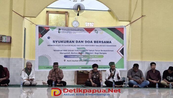 Sorong, Detikpapua.Net – Badan Koordinasi Himpunan Mahasiswa IsIam (Badko HMI) Provinsi Papua Barat Daya menggelar acara syukuran dan doa bersama dalam rangka 79 tahun Milad HMI dan menyambut Bulan Suci Ramadhan yang digelar di Panti Asuhan Emeyodere Jalan Victory Kota Sorong, Sabtu (07/02/2026).