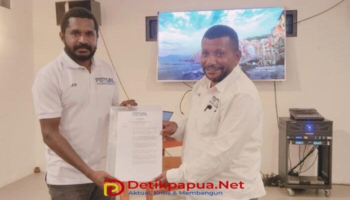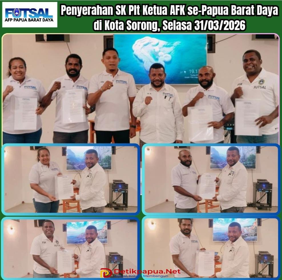 Sorong, Detikpapua.Net – Plt Ketua Asosiasi Futsal Provinsi (AFP) Papua Barat Daya Bartholomeus Asem, S.Pi.MP secara resmi menyerahkan Surat Keputusan (SK) bagi ketua Asosiasi Futsal Kabupaten/Kota (AFK) di 5 Kabupaten 1 Kota se-Provinsi Papua Barat Daya.