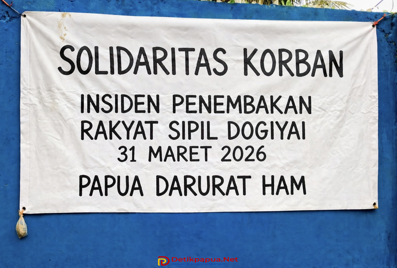 Salah satu spanduk yang dibentangkan dalam aksi tersebut bertuliskan: “Polda Papua Tengah segera adili dan pecat pelaku yang menewaskan rakyat sipil di Dogiyai pada 31 Maret 2026.”